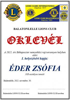 A Balatonlelle Lions Club idén is részt vett a Békeposzter rajzversenyen a Balatonlellei Általános Iskola diákjaival. A gyerekrajzok közül ötöt díjaztak. November 30-án adták át az elismeréseket az iskola tanulói és tanárai előtt.